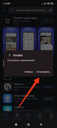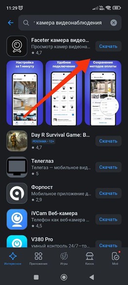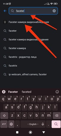 - Для установки приложения Faceter необходимо открыть Rustore, в строке поиска вводим Faceter, в подсказках поиска ниже мы видим необходимое нам приложение, Faceter камера видеонаблюдения, нажмите на него.